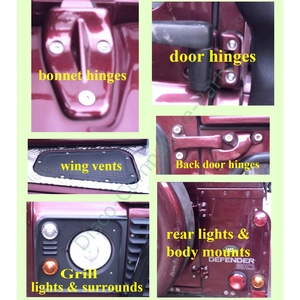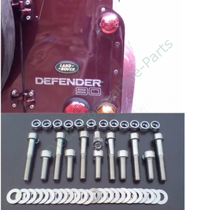 Product Name: Land Rover Defender Stainless Steel Rear Door Bolts Kit contains : 12 x A2 stainless steel socket cap bolts, lock nuts & washers Suitable for : All Land Rover Defender 90, 110 & 130 models These are a straight forward direct exchange for the normal mild steel and probably rusty bolts which Land Rover fit.